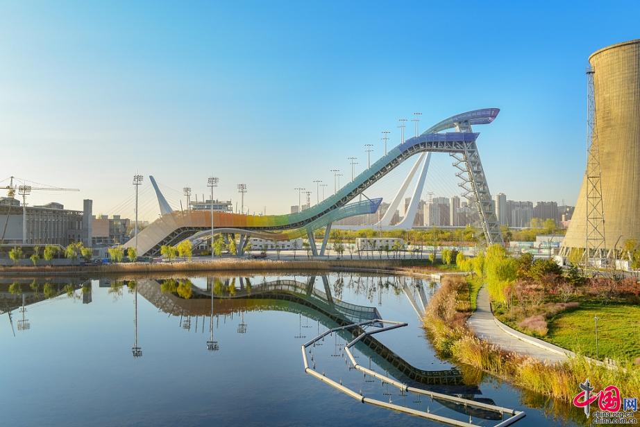 Photo prise le 8 novembre 2020 à Beijing, montrant la plateforme de saut à ski de Shougang. Il s'agit du site officiel de la compétition de saut à ski des Jeux olympiques d'hiver de Beijing 2022.