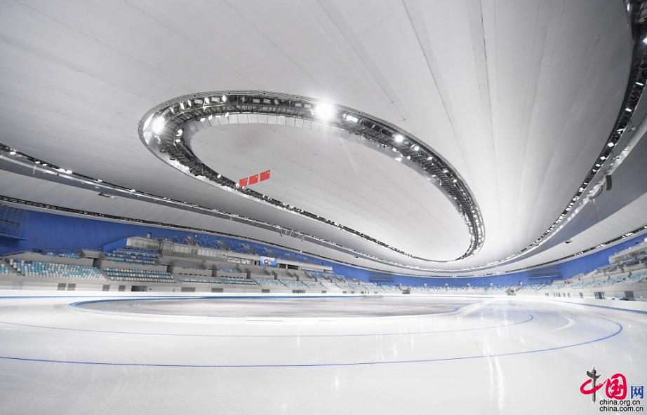 Photo prise le 22 janvier 2021 à Beijing, montrant l'Anneau national de patinage de vitesse. C'est le seul site de compétition pour les épreuves sur glace nouvellement construit dans la zone principale des JO de 2022. L'Anneau national de patinage de vitesse de Beijing accueillera 14 épreuves différentes aux JO d'hiver de 2022.