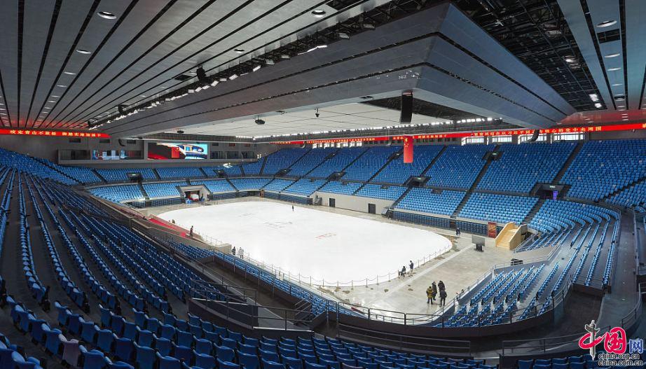 Photo prise le 7 janvier 2021, montrant une vue intérieure du Palais omnisport de la capitale. Le Palais omnisport de la capitale accueillera des épreuves de patinage de vitesse sur piste courte et de patinage artistique aux JO d'hiver de 2022.