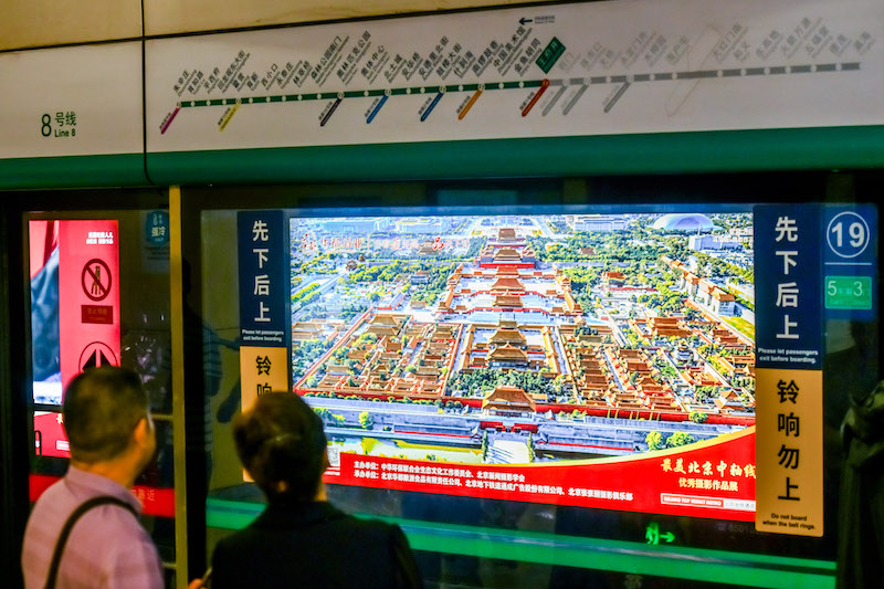 En septembre, 150 photos des « plus belles vues de l'axe central de Beijing » sont également exposées dans les stations Qianmen, Wangfujing, Jinyu Hutong et Zhushikou de la ligne 8 du métro.
