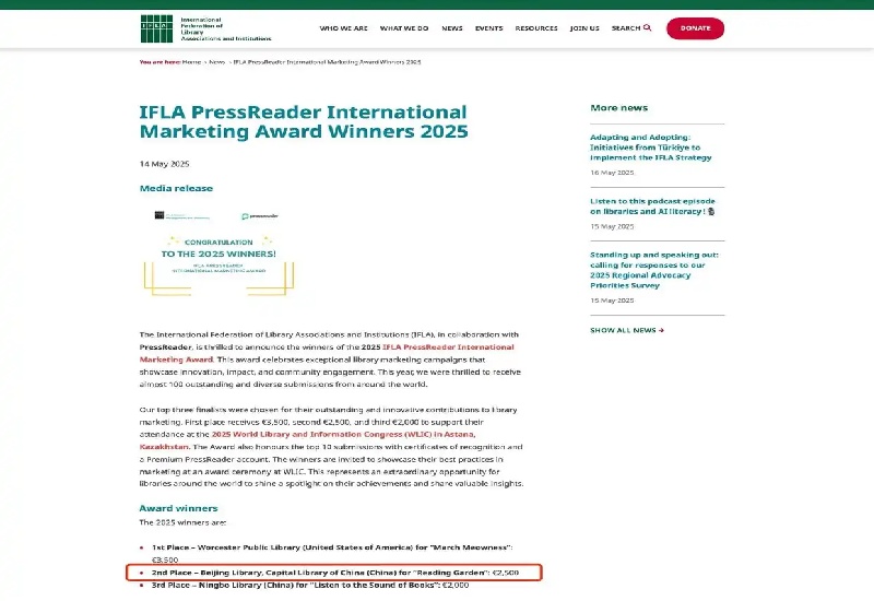 Récemment, la Fédération internationale des associations et institutions de bibliothèques (IFLA) a publié sur son site web la liste des lauréats du prix international IFLA PressReader 2025. La bibliothèque de la capitale a obtenu la deuxième place grâce à son projet « Jardin de lecture » mené à la bibliothèque de Beijing.