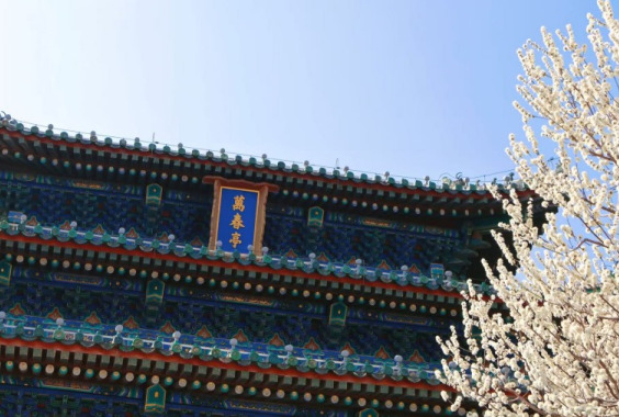 Dans le parc Jingshan, les branches sont chargées de fleurs luxuriantes, formant un contraste pittoresque avec les anciens bâtiments aux murs rouges.