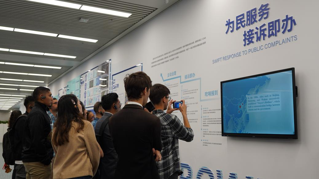 Au Centre des services de la ligne d'assistance aux citadins, les journalistes ont découvert le fonctionnement de la ligne d'assistance 12345 ainsi que l'évolution du mécanisme de « réponse rapide aux plaintes du public ». Le personnel leur a expliqué que la ligne 12345 était le principal canal et la principale plateforme de ce dispositif, qui utilisait l'analyse des mégadonnées pour anticiper les risques urbains et explorer un nouveau modèle de traitement proactif des demandes avant même qu'elles ne soient formulées. Les journalistes ont assisté en direct, grâce à une technologie de traduction vocale instantanée basée sur l'IA, au traitement des demandes des appels par les opérateurs, et ont visité diverses plateformes numériques, notamment les postes intelligents, les postes en ligne, les postes dédiés aux entreprises, les postes en langues étrangères, les postes en langue des signes ainsi que le système de commandement et de coordination d'urgence.