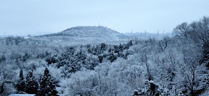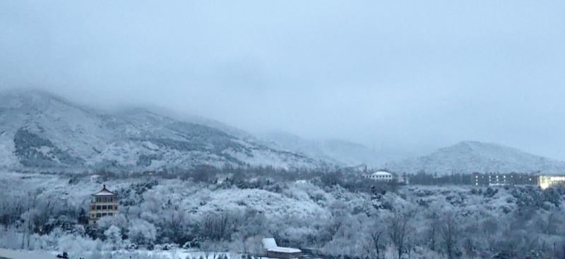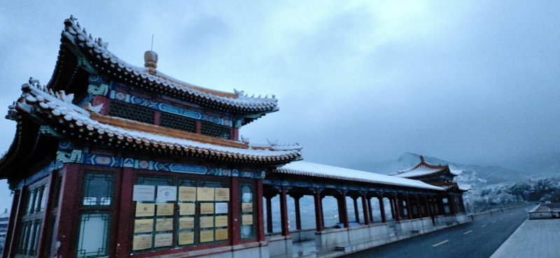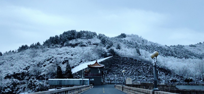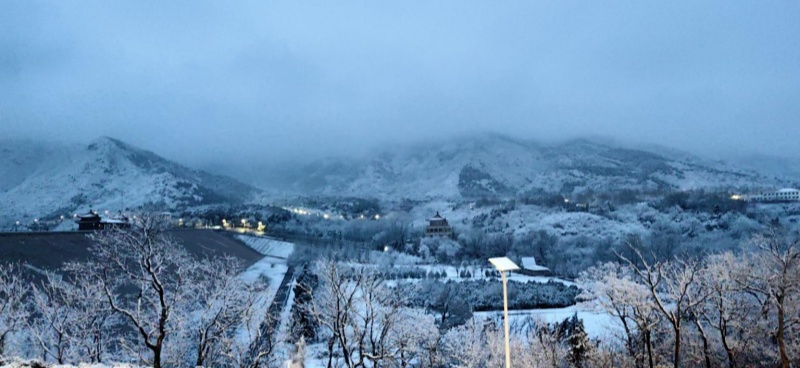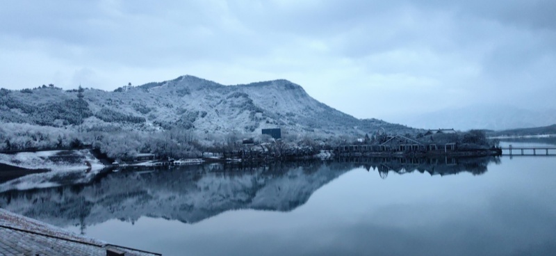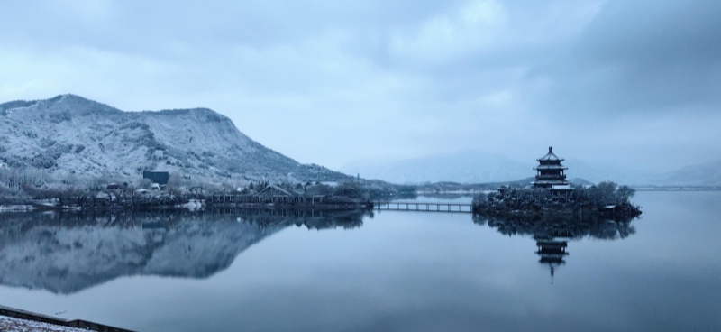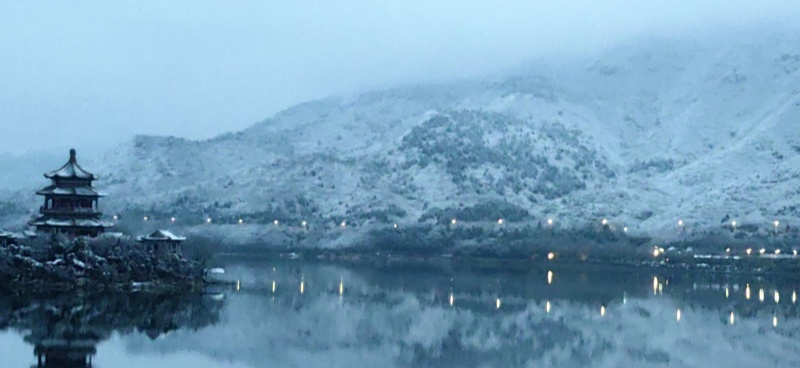 La première neige après la Fête du Printemps est tombée avec douceur. La neige recouvre les hauteurs alentour alors que s'éveillent les premières lueurs de l'aube. Dans le district de Changping, le lac et les montagnes du réservoir des Tombeaux des Ming offrent un paysage d'une grande sérénité, digne d'une peinture à l'encre.