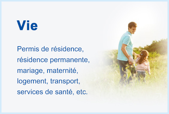 Permis de résidence, résidence permanente, mariage, maternité, logement, transport, services de santé, etc.