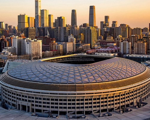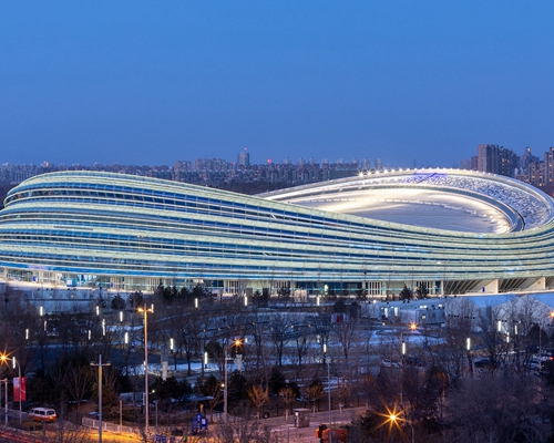 Présentation : Ce site emblématique des Jeux olympiques d'hiver de Beijing 2022 est connu pour son toit en forme de selle, et sa façade entourée de 22 rubans de glace.
