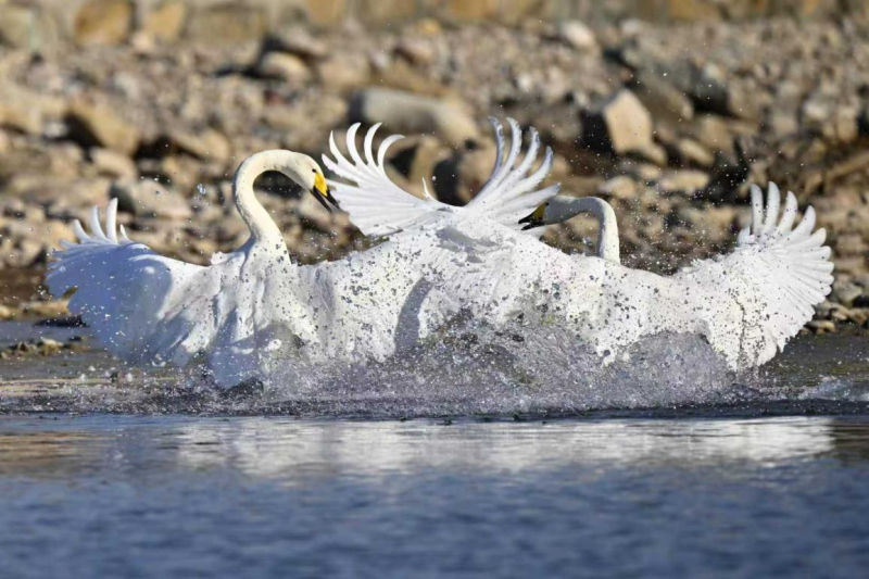 Dans le bassin de Lugezhuang, à Taishitun, sur le cours de la rivière Qingshui, dans le district de Miyun, plusieurs groupes de cygnes ont également été observés récemment, volant depuis les rives des réservoirs vers cette zone. On peut y admirer des scènes où des cygnes sauvages, des cygnes siffleurs et des cygnes tuberculés se rassemblent dans un même étang pour passer l'hiver.