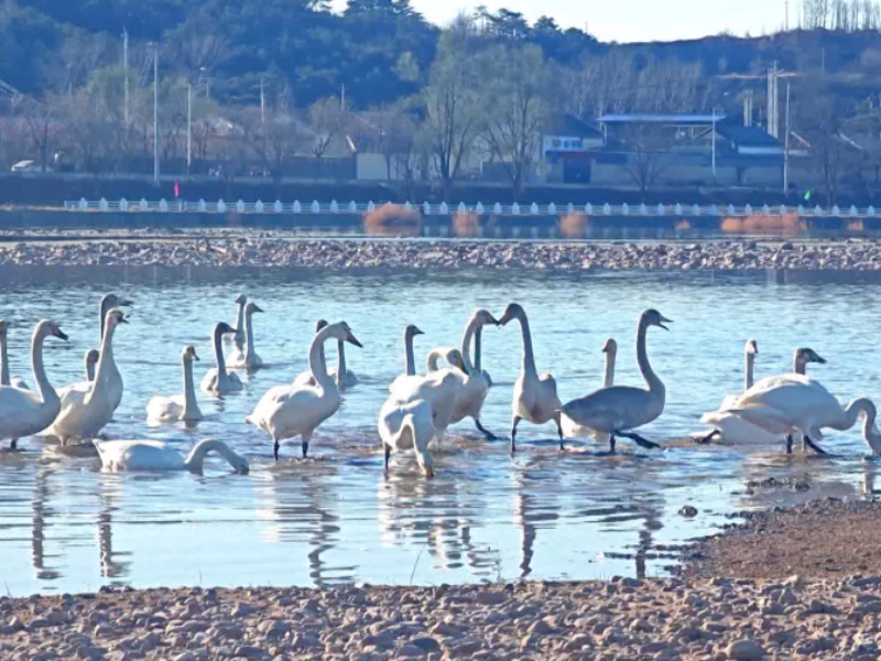 Cet hiver, la section de Taishitun de la rivière Qingshui à Miyun, Beijing, a accueilli un gracieux groupe d'invités : plus de soixante cygnes sont successivement arrivés pour hiverner dans ce lieu. De manière surprenante, des ornithologues amateurs ont pour la première fois capturé ici cette scène précieuse de trois espèces rares de cygnes – le cygne chanteur, le cygne tuberculé et le cygne siffleur – cohabitant en groupes mixtes.